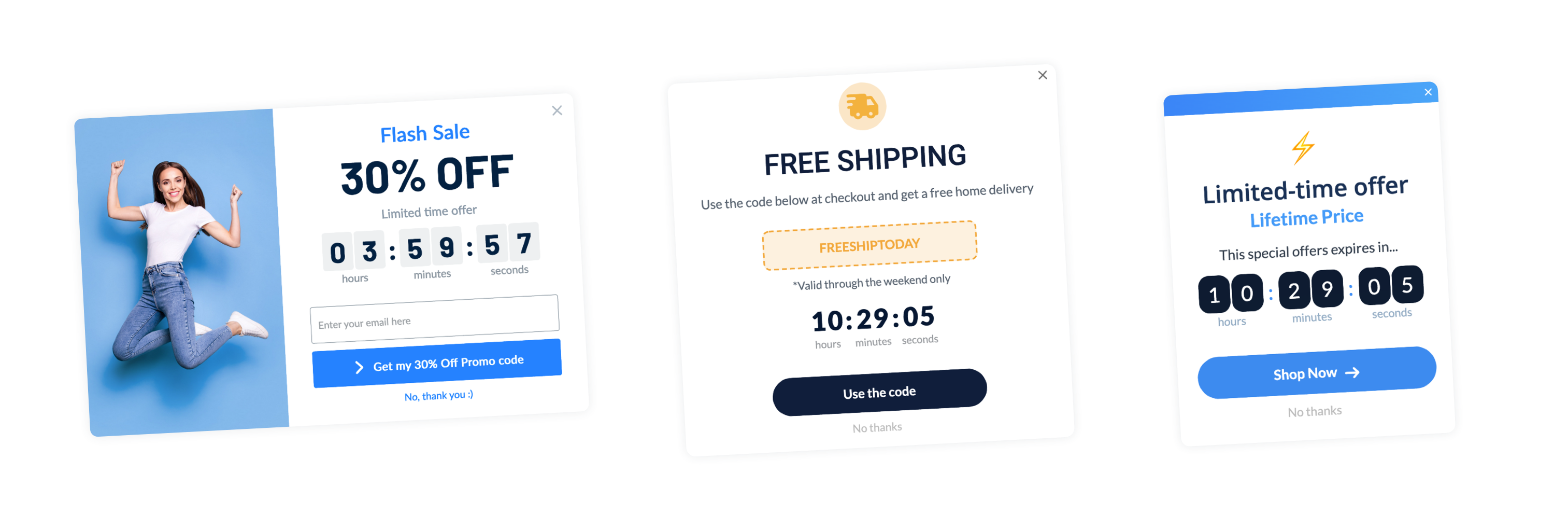 If you have an offer for a limited period, countdown popups can help you promote them the right way by driving urgency.