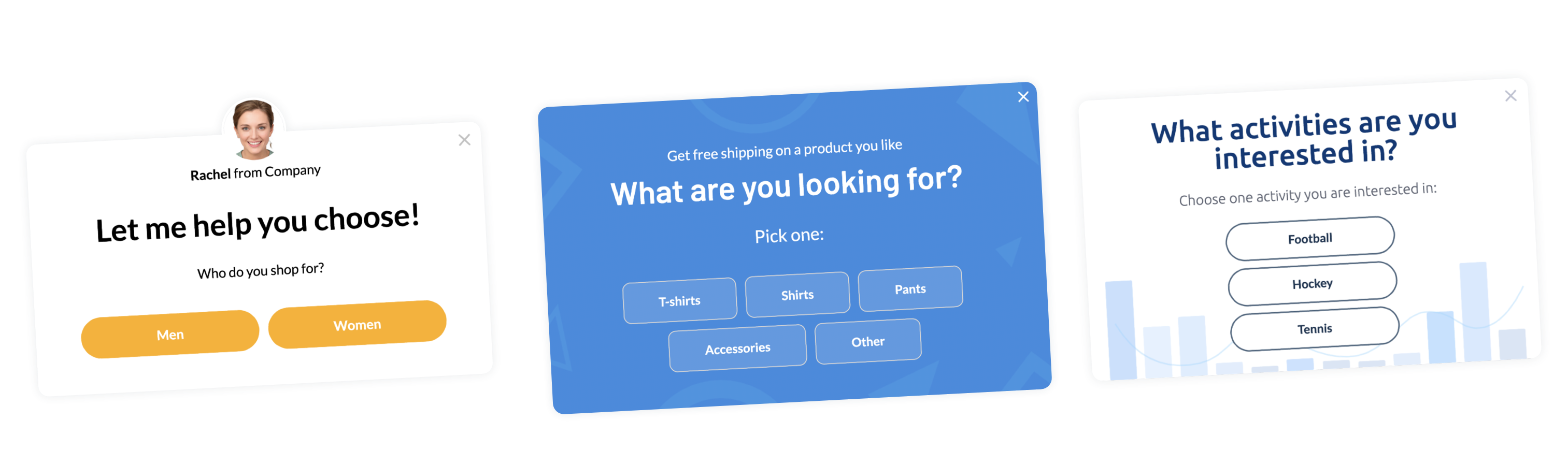 Start by asking questions to your visitors to know more about them. You can display multiple steps to segment your visitors and to be able to send them to the right page find the right product or offer.